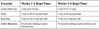 The Focus: Move to the Weeks 3-4 Reps/Time column. For Push-Ups, try doing at least one set in the Knee Push-Up position (rather than the high incline). For Planks, try going to the full Toe Plank position.
