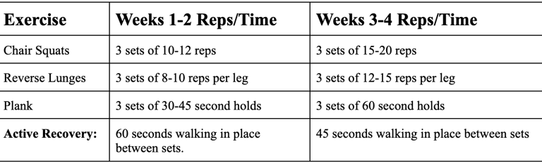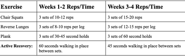 The Focus: Use the Beginner Modifications for all exercises you do not feel strong enough to do (Chair Squats, Incline Push-Ups, Knee Plank if needed). Track your sets and reps from the Week 1-2 column above.
