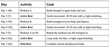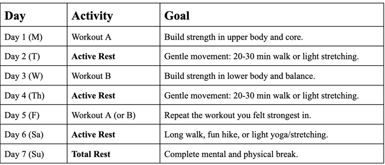 We will use an alternating workout schedule (A/B/Rest) and gradually increase the workload each week. The workouts should take between 15 and 25 minutes, total.
