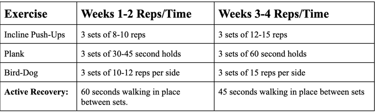 Workout A: Upper Focus (Push-Ups, Plank, Bird-Dog)